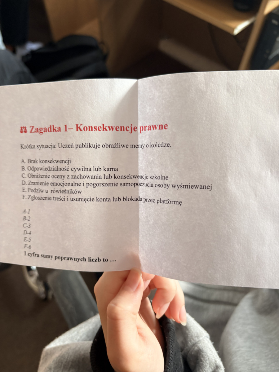 Podczas zajęć uczniowie, pracując zespołowo, rozwiązywali zagadki i wykonywali zadania związane z bezpiecznym korzystaniem z internetu, rozpoznawaniem hejtu oraz sposobami przeciwdziałania negatywnym zachowaniom w sieci. Każde z wyzwań wymagało logicznego myślenia, współpracy oraz refleksji nad konsekwencjami własnych działań online.