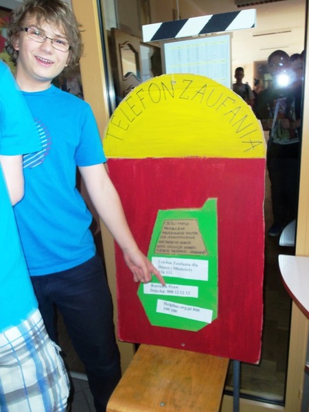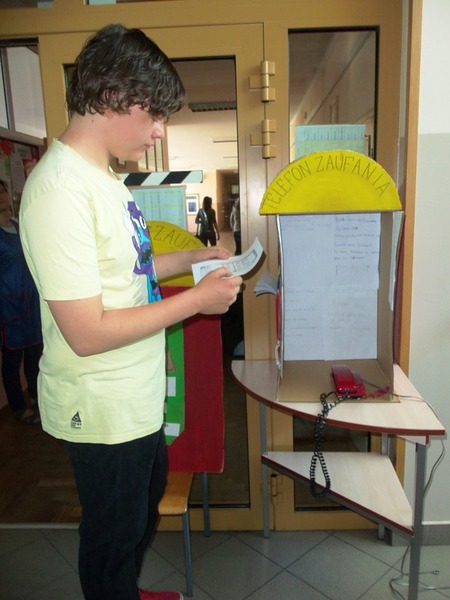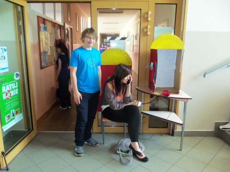 W naszej szkole... happening. 17 maja włączyliśmy się do akcji promującej telefony zaufania dla dzieci i młodzieży. Była budka telefoniczna, ulotki, piosenka Grzegorza Ciechowskiego. Jeśli masz problem – zadzwoń.