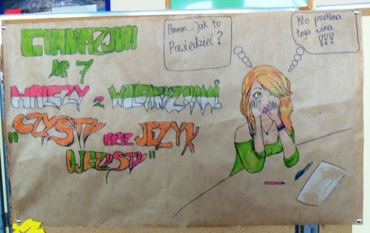 My także włączyliśmy się kampanii pod patronatem Prezydenta RP "Oj czysty język" i postanowiliśmy powalczyć z wulgaryzmami. Klasy przygotowały ciekawe plakaty, a nauczyciele skrupulatnie odnotowywali wszelkie przejawy łamania czystości naszego języka. Najlepszy plakat wykonała klasa 1a, natomiast klasa 2c zwyciężyła w kategorii "Czysty język". Zwycięzcom gratulujemy!