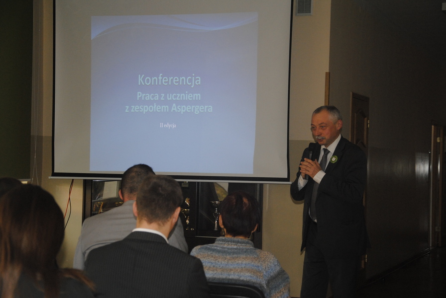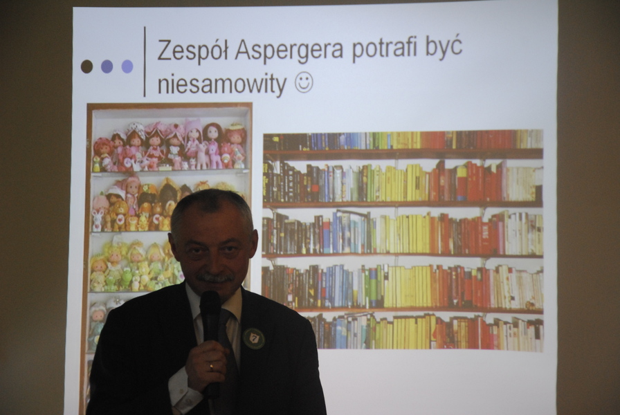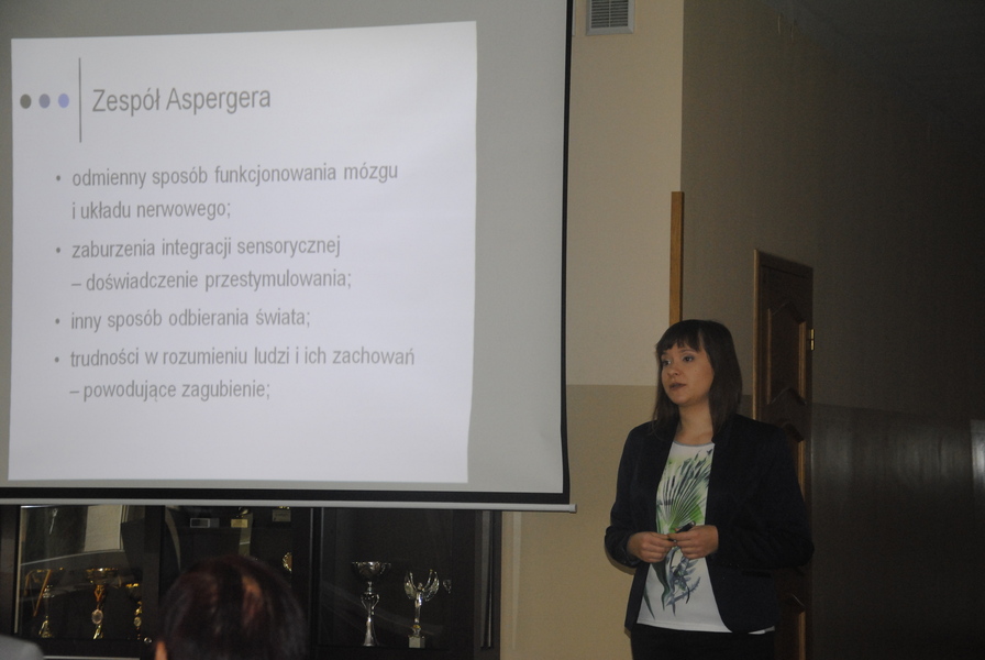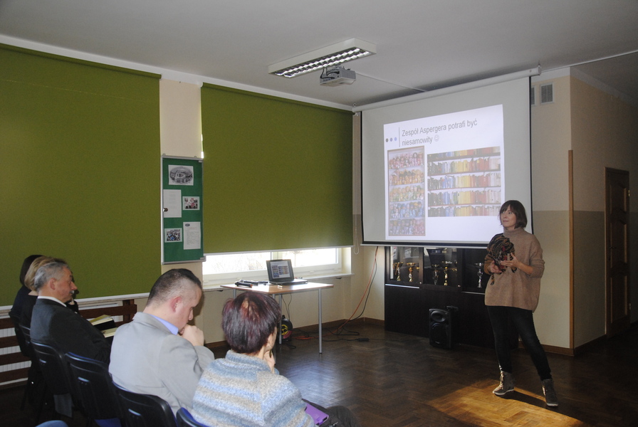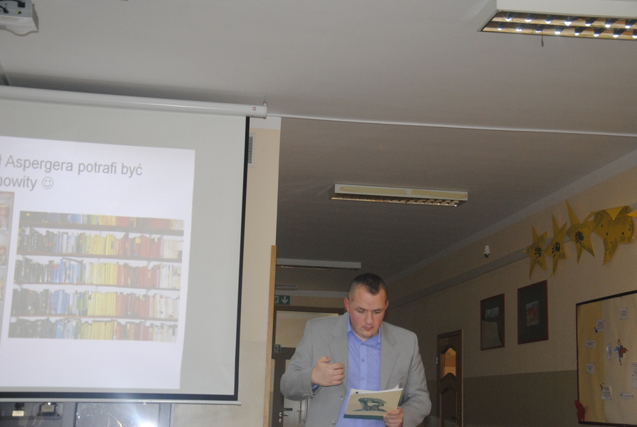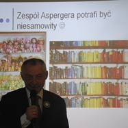 Wykład wprowadzający w problematykę pracy z uczniem z zespołem Aspergera poprowadziła pani psycholog z poradni. Swoimi niezwykle cennymi doświadczeniami, radościami i smutkami dzielili się rodzice uczniów. Osobistymi wspomnieniami z lat edukacji szkolnej jak i po jej zakończeniu opowiadał Pan Adam Drewniak.