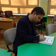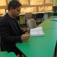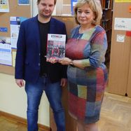 [miniatura: p. Borkowski podpisuje egzemplarz autorski dla biblioteki]