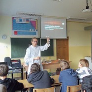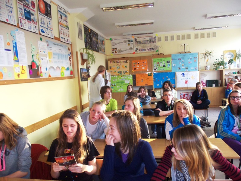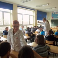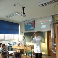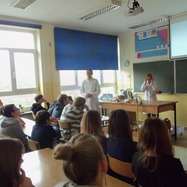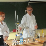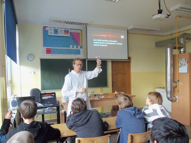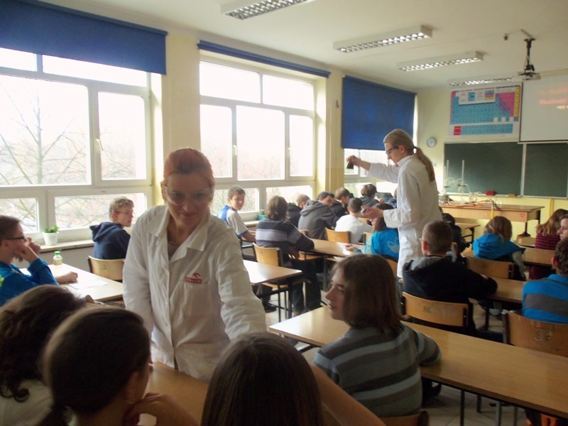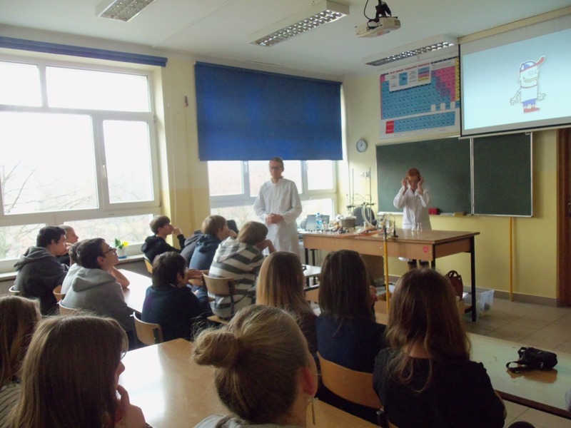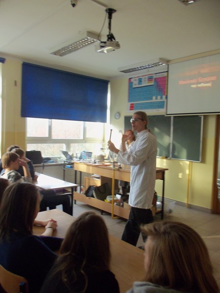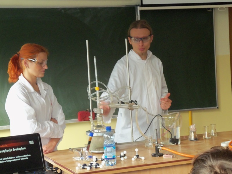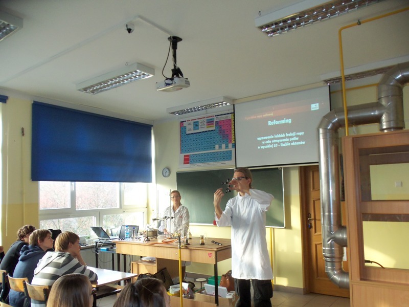 15 listopada w pracowni chemicznej odbyła się lekcja chemii prowadzona przez doktoranta Instytutu Przemysłu Chemicznego - p. Lucjana Staszewskiego. Pan Lucjan zawiaduje firmą Fugas zajmującą się organizowaniem pokazów chemicznych dla szkół oraz współpracuje z Centrum Nauki Kopernik jako animator, ekspert i konsultant od spraw doświadczeń chemicznych. Do naszej szkoły przyjechał z asystentką Pauliną i ekranowym ludzikiem Petrosem, aby w ramach projektu edukacyjnego sponsorowanego przez PKN ORLEN opowiedzieć nam o ropie naftowej. Na stole laboratoryjnym ustawiona została mini aparatura destylacyjna, z której przez całą lekcję kapały poszczególne frakcje. Uczniowie klasy 2a i 2c mieli okazję zbadać właściwości fizyczne i chemiczne ( rozpuszczalność, lepkość, zapach) ropy naftowej, dowiedzieć się, w jakich produktach niekojarzących się na co dzień z ropą ma ona zastosowanie ( zabawki, leki , tkaniny) oraz dlaczego ceny tego "czarnego złota" podawane są w dolarach, co to jest baryłka (galon) i jaką ma objętość . Dla najaktywniejszych uczniów organizatorzy przygotowali nagrody niespodzianki . Nasz gość, po zajęciach powiedział, że jego głównym celem było pokazać, wytłumaczyć i nauczyć, że chemią można się bawić, czerpać z niej wiele praktycznych wiadomości. Cele zostały zrealizowane. Postaramy się zaprosić pana Lucjana na inne atrakcyjne pokazy ( wybuchowe?) do naszej pracowni.