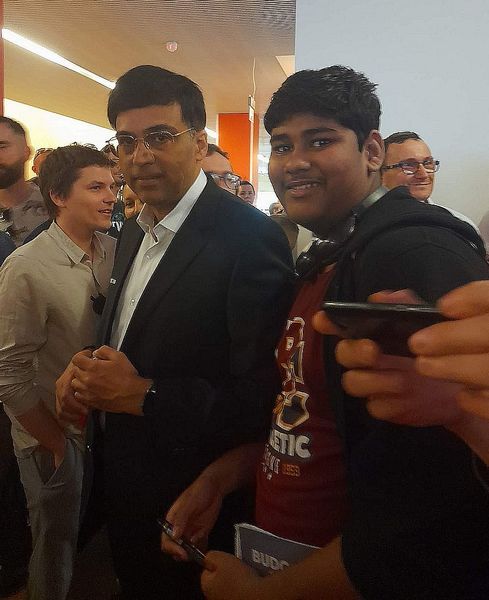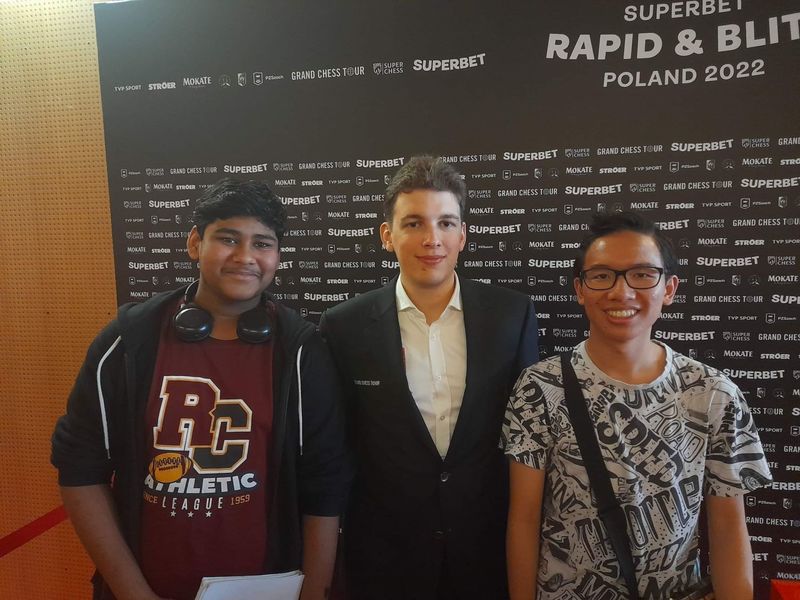 Nasi szachiści, Mariusz Viet Dung To (aktualny mistrz CLVI LO) i Lawarance Chettiar, skorzystali z okazji aby nie tylko obejrzeć arcymistrzów w akcji, ale też zrobić parę pamiątkowych zdjęć i autografów. Na zdjęciu obok sala turniejowa. Na zdjęciach w galerii m.in. obaj chłopcy z Janem Krzysztofem Dudą, aktualnym mistrzem Polski, zdobywcą Pucharu Świata 2021 i kandydatem w turnieju o mistrzostwo świata w 2022 r. oraz Lawarance z Viswanathanem Anandem, byłym mistrzem świata.