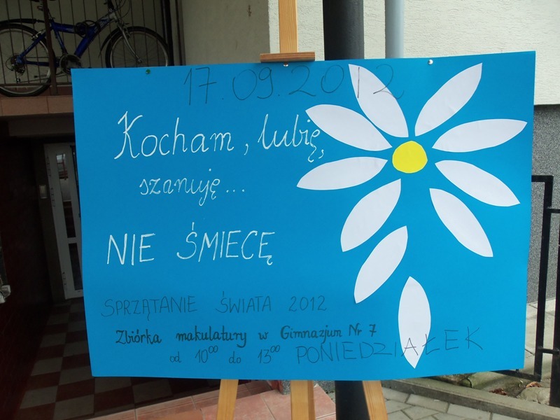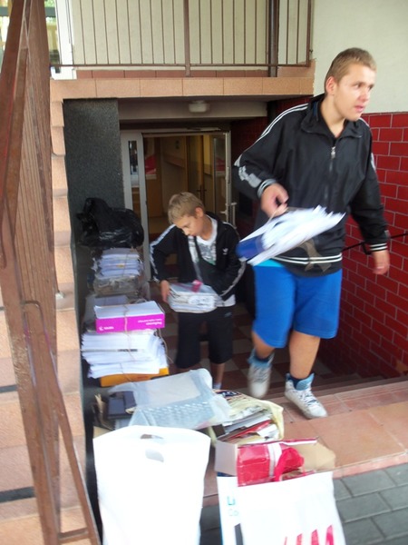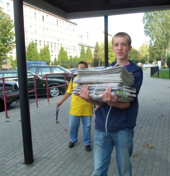 W tym roku w naszym gimnazjum , w ramach corocznej akcji "Sprzątanie Świata" zbieraliśmy makulaturę. Przez 2 tygodnie uczniowie przynosili powiązane papierowe paczki. Gromadziliśmy je w magazynku w szatni. W ostatnich dniach zbiórki roznieśliśmy ulotki po okolicznych domach włączając do akcji mieszkańców Sielc. 18 i 20 września odwieźliśmy makulaturę do skupu przy ul. Bluszczańskiej. Wykonaliśmy 5 kursów: skup - szkoła. Wynik przekroczył nasze oczekiwania - zebraliśmy okrągłą TONĘ makulatury. Dziękujemy wszystkim, którzy przyłączyli się do akcji sprzątania okolicy. Pieniądze ze zbiórki przekazano samorządowi szkolnemu i Kołu PCK.