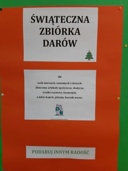 W tym roku nasza szkoła zorganizowała ŚWIĄTECZNĄ ZBIÓRKĘ DARÓW dla osób starszych, samotnych, chorych. Wszystkie zebrane rzeczy zostały przekazane Ośrodkowi Pomocy Społecznej na Mokotowie.