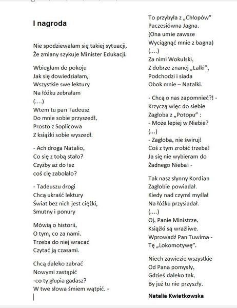 - Pierwsza jest bezdyskusyjna – zdobyła Natalia z kl. 3c za lekką, dowcipną formę rymowanki i przewrotne potraktowanie tematu (bo poradziła Ministrowi z pomysłu zrezygnować ;)