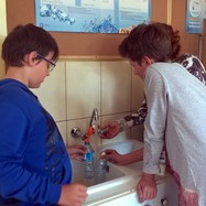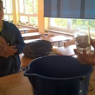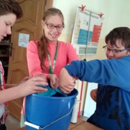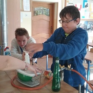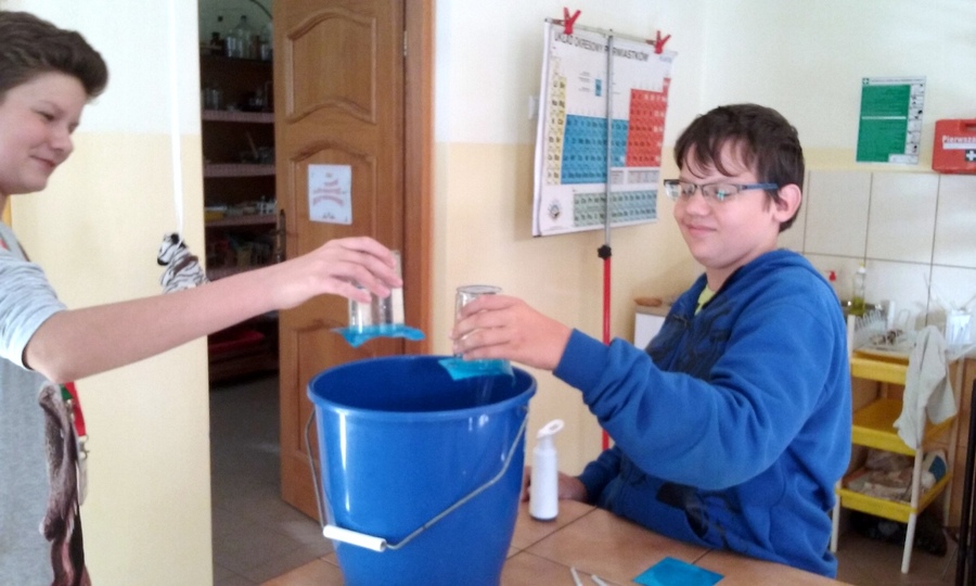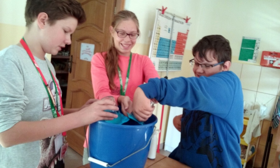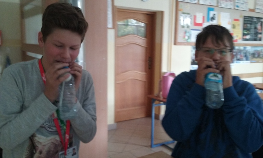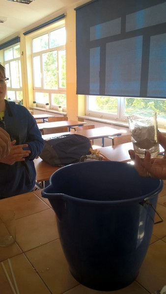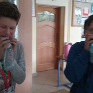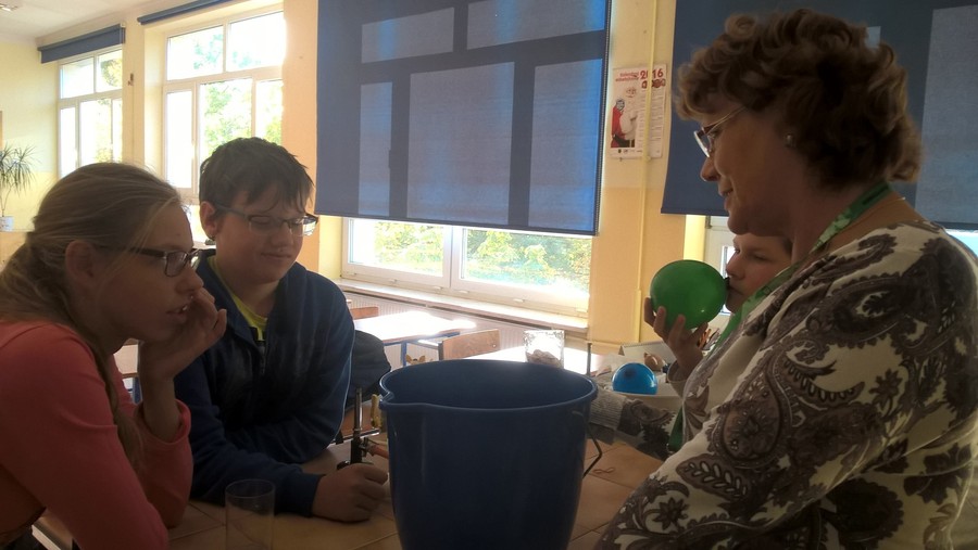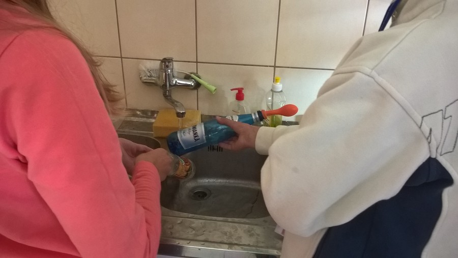 Na inauguracyjnym kółku naukowym robiliśmy doświadczenia z powietrzem. Emilka, Staś, Krzysio, Janek m.in. sprawdzali, jak wykorzystać ściśliwość powietrza do nadmuchiwania balonów, co się dzieje z balonem w próżni ( którą sami wytwarzali), jak włożyć papier do wody i wyjąć go zupełnie suchy, porównywali właściwości ciepłego i zimnego powietrza, odwracali szklankę pełną wody do góry dnem tak aby woda się nie wylała, a na koniec każdy zrobił balonowy szaszłyk. Nad wszystkimi pracami czuwała p. E. Jędryszczak-Sznajder i p. Agata Długosz