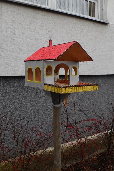 Ptaki - głównie sikorki - nadal chętnie odwiedzają to miejsce, tym bardziej że na zimę panowie postawili regularnie zaopatrywany karmnik. Drugi stanął przy głównym wejściu. Oświetlenie na nim zamontowane ptakom wprawdzie nie robi różnicy,ale nas cieszy, gdy już po ciemku wychodzimy ze szkoły.
