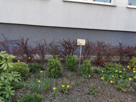 [miniatura: kwitnące żonkile na tle muru szkoły]