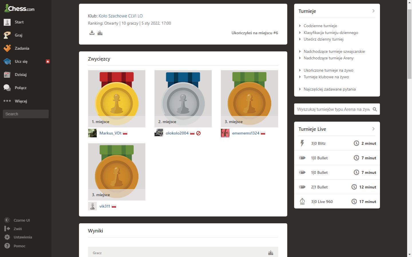 Udział wzięło 35 szachistów; najszybsi rozegrali po kilkanaście partii. Zwycięzcą został gracz o nicku elephantPingu174 (Michał Słoniewski, VIII LO im. Władysława IV), 14 zwycięstw pod rząd, 53 p.