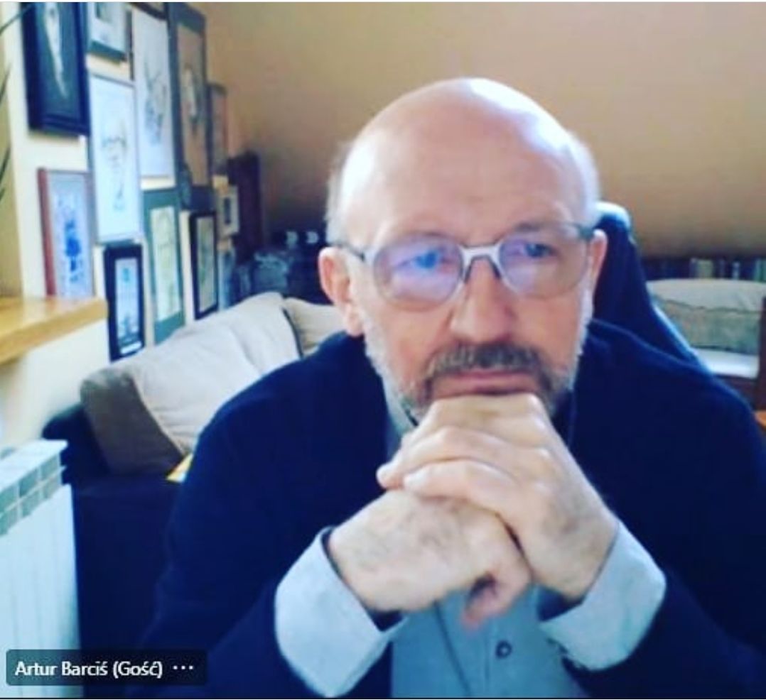 Niesamowita frajda, niecodzienny gość. Przed Państwem Artur Barciś. Witamy w naszych skromnych progach! Nasz dzisiejszy gość zwycięsko wyszedł z krzyżowego ognia pytań: po co nam porażki, co motywuje do działania, czy warto przejmować się krytyką innych... (Miniatura: zrzut ekranu: Artur Barciś w trakcie spotkania online)